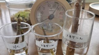 実験・チャレンジ ウンベラータの水挿し対決!水 vs メネデール水、根が出るのはどっち?④(最終回) こんにちは、すてこけです。5月1日より実験を開始していよいよ約1か月。これまで、水道水組、メネデール水組で比較しながら成長の様子をみてきました。今回はその完結編として、発根や葉の展開の差、感じたことなどをまとめます。前回記事:ウンベラータの... 2025.05.29 実験・チャレンジ